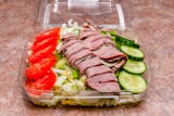 Lettuce, tomatoes, cucumbers, onions, green peppers, turkey, roast beef, ham, provolone cheese.
